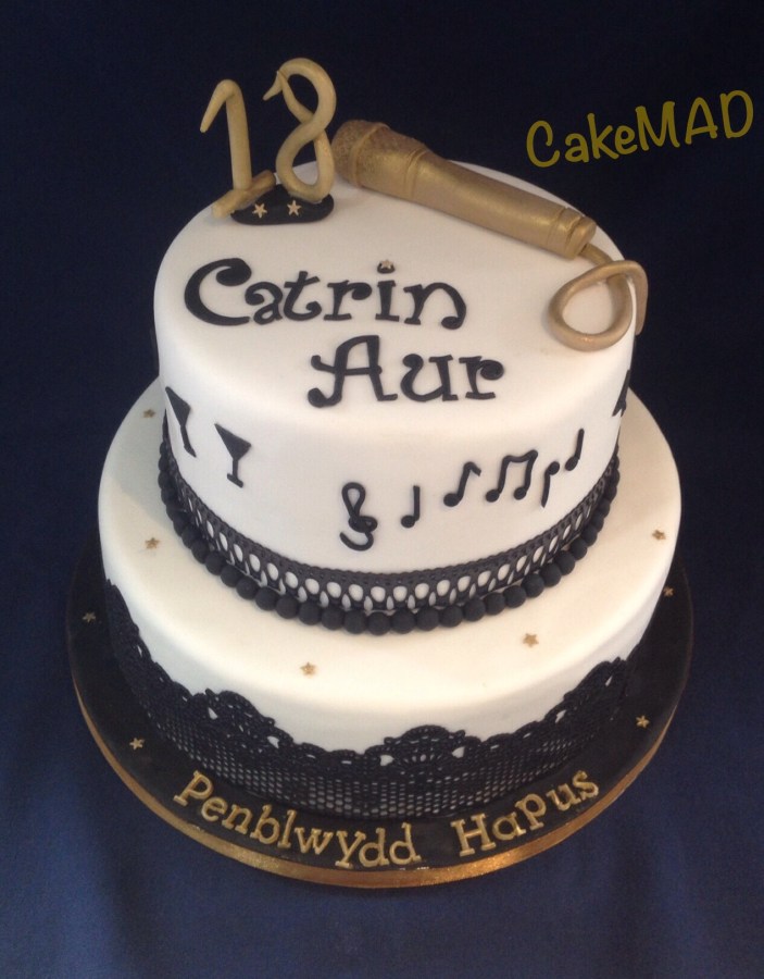 18th birthday cake, black, white and gold, with musical theme.