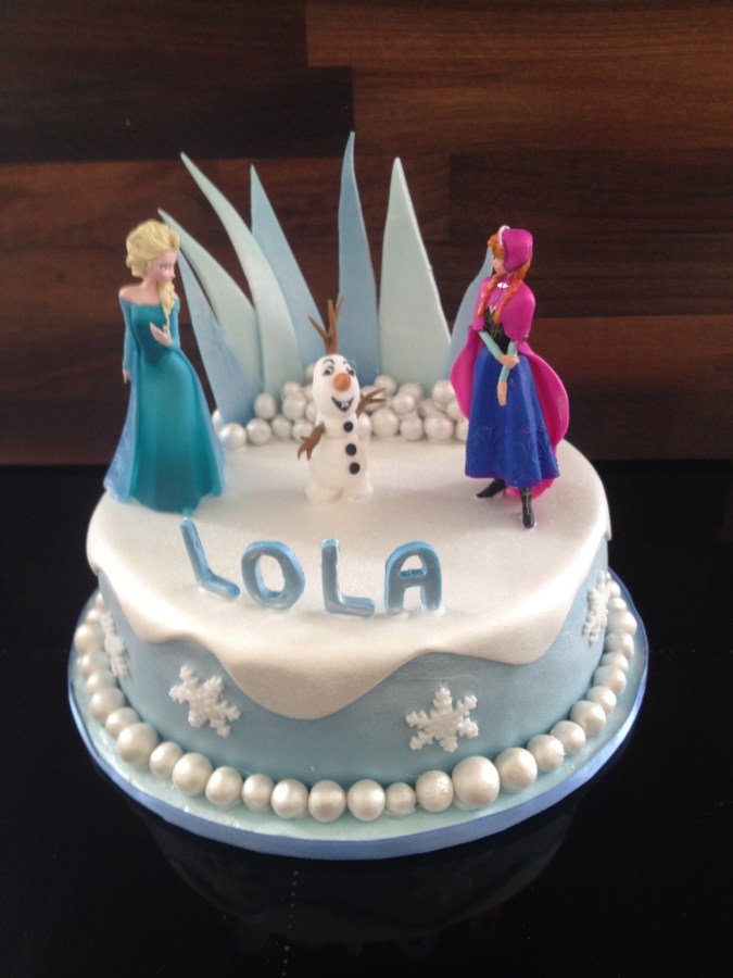 Single tier frozen cake. Plastic figurines, edible Olaf.