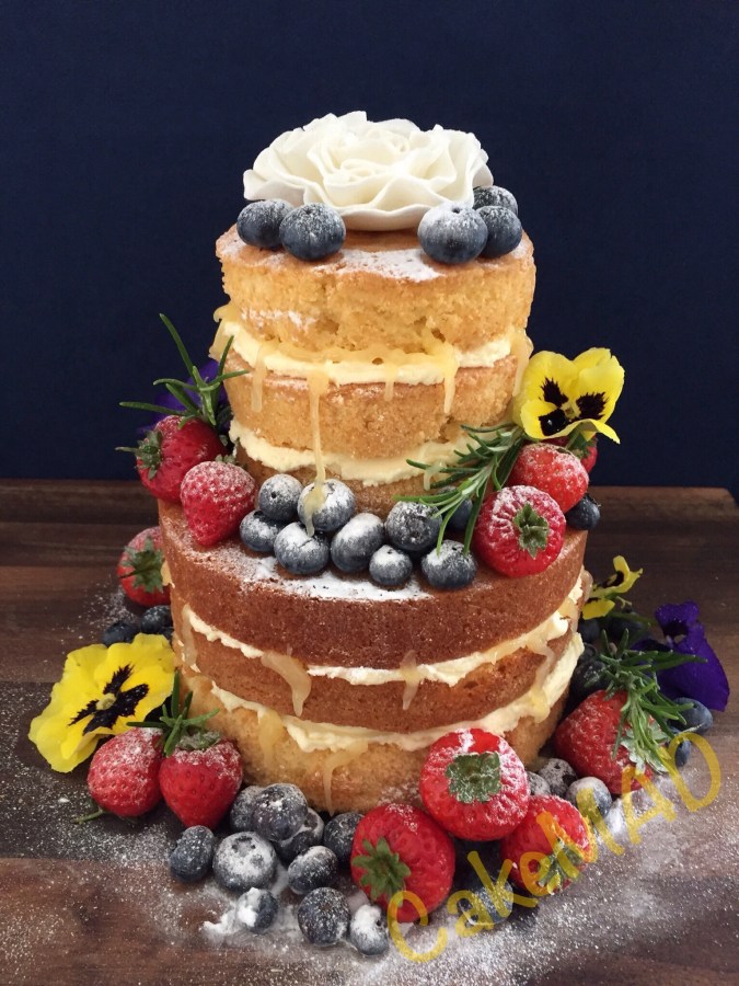 “Naked” wedding cake, with fruit and edible flowers